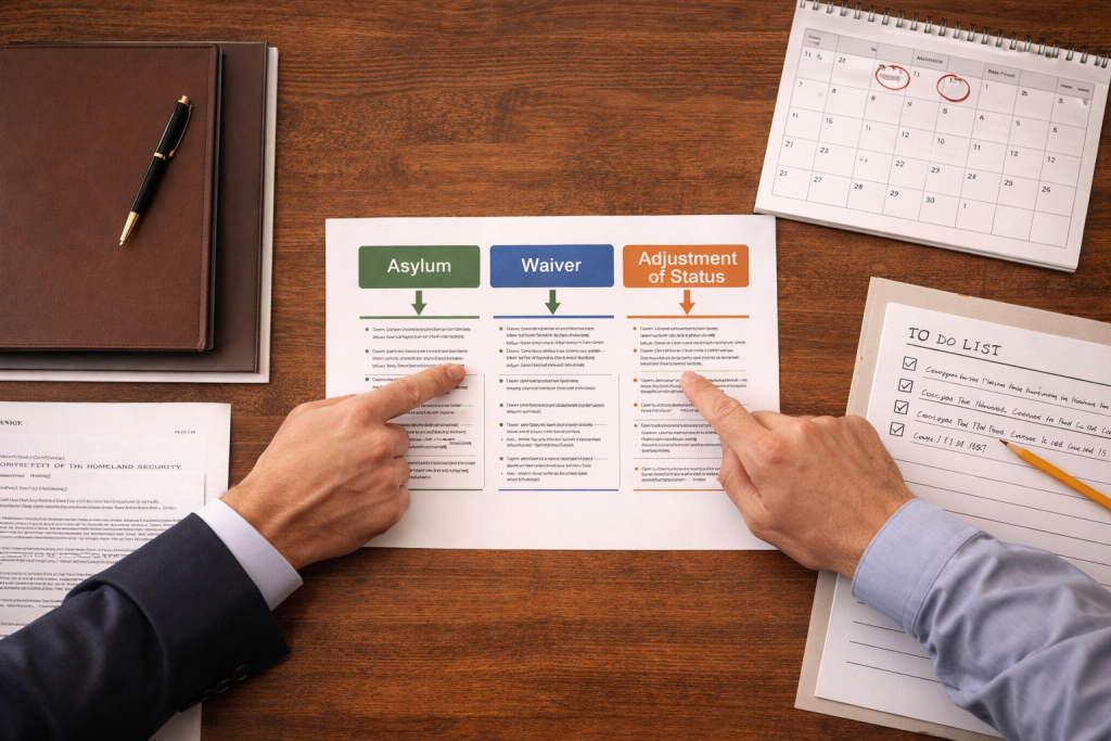 Together, we choose the best legal path, whether it is asylum, a waiver, or adjustment of status, ensuring a clear and confident direction for your defense.